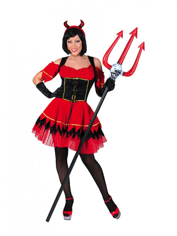 Sexy rood duiveltjes jurk met zwarte en goudkleurige details.