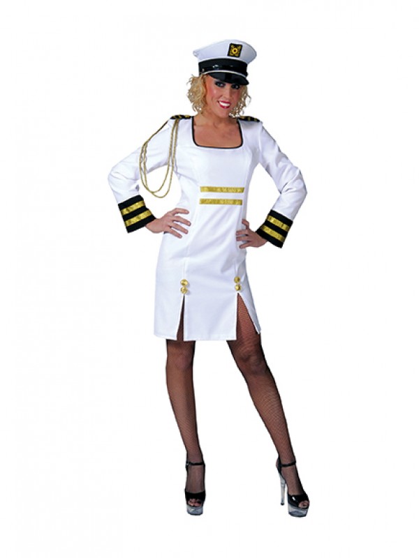 Witte kapiteinjurk met goudkleurige details. De rok heeft enkele splits